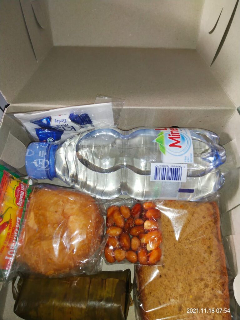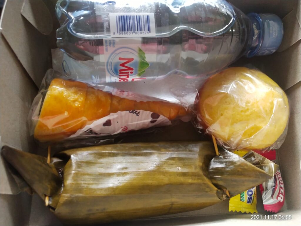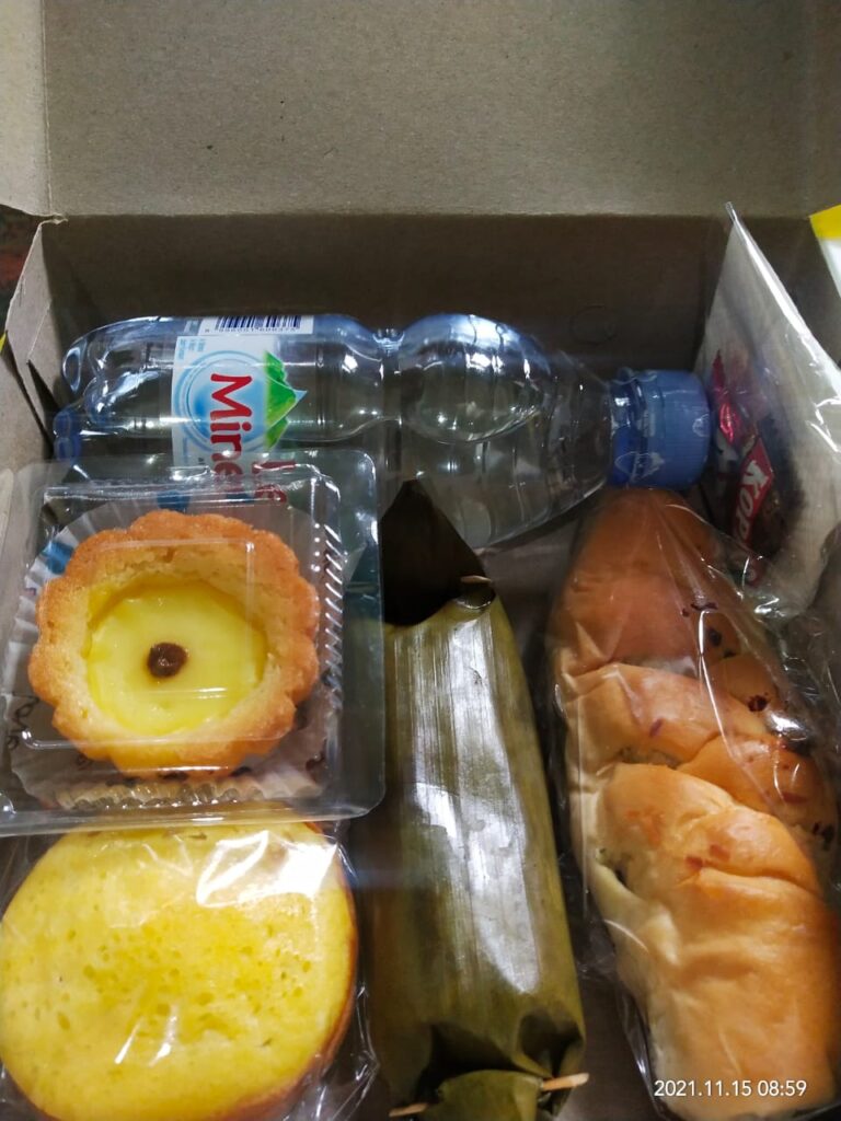 Isi Menu : Roti Isi Ayam, Arem – arem, Kue kik Gula merah, Minuman Mineral Botol.